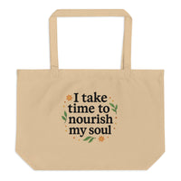 A gentle reminder on the go. This spacious durable tote features the affirmation " I Take Time to Nourish My Soul"- a perfect blend of practicality and mindfulness for every day life.